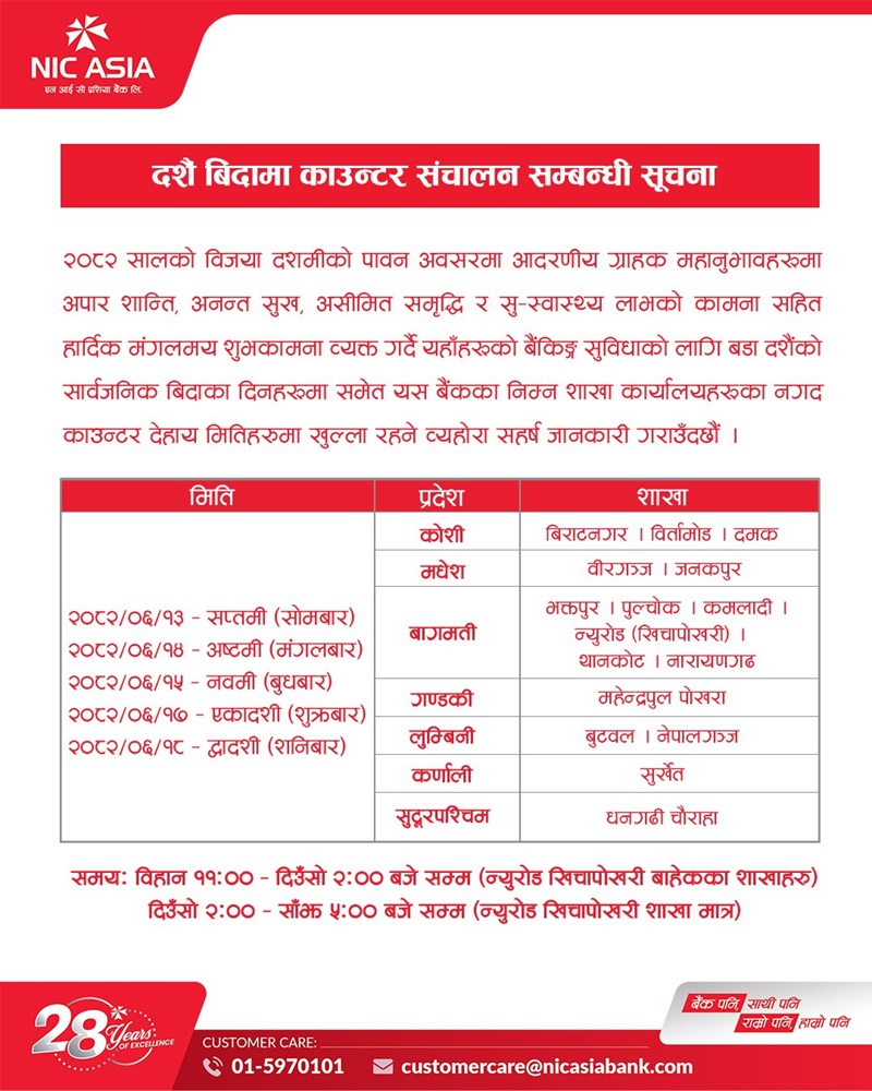 काठमाडौं । आगामी विजया दशमी २०८२ का अवसरमा दशैं बिदा भए तापनि एनआईसी एशिया बैंकका केही शाखा सञ्चालन हुने भएका छन् । बैंकले ग्राहकहरूको बैंकिङ आवश्यकतालाई सहज बनाउन दशैंको सार्वजनिक बिदाका दिनहरूमा पनि नेपालभरका चयनित शाखाहरू खुला रहने जानकारी दिएको हो ।