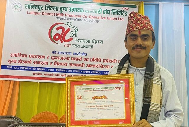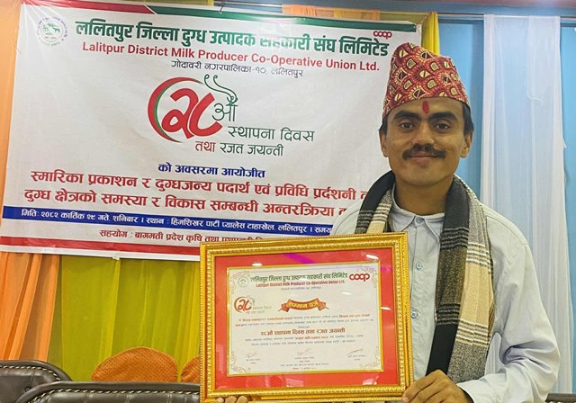 ललितपुर । ललितपुर जिल्ला दुग्ध उत्पादक सहकारी संघ लिमिटेडले सक्रिय पत्रकार निराज रानाभाटलाई सम्मानित गरेको छ । ललितपुर जिल्ला दुग्ध उत्पादक सहकारी संघ लिमिटेडको ‘ २८ औं स्थापना दिवस ’ पारेर ‘ रजत जयन्ती ’ मनाउनुका साथै भव्य रुपमा संघले रानाभाटलाई सम्मान गरेको हो । स्थापनादेखि अहिलेसम्म गरेको महत्वपूर्ण कार्यहरु, ललितपुर जिल्लामा दुग्ध क्षेत्रमा भएका महत्वपूर्ण गतिविधिहरु, दुग्धसँग सम्बन्धित विभिन्न ज्ञादवर्दक सामग्री समेटेको ‘ स्मारिका पुस्तक प्रकाशन, दुग्धजन्य पदार्थ एवं प्रविधि प्रर्दशनी तथा दुग्ध क्षेत्रका समस्या र विकास सम्बन्धी अन्तरक्रिया कार्यक्रम ’मा प्रचारप्रसार गरेर सहयोग पुर्याएको योगदानको पुर्याएकोले सम्मान गरिएको हो ।