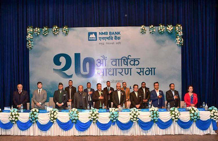 काठमाडौं । एनएमबि बैंकको २७ औं बार्षिक साधारण सभा सम्पन्न भएको छ । बैंकका संचालक समितिका अध्यक्ष, सञ्चालक र सेयरधनीहरुको उपस्थितिमा सभा आज काठमाडौंको कमलादी नेपाल प्रज्ञा प्रतिष्ठानमा सम्पन्न भएको हो ।