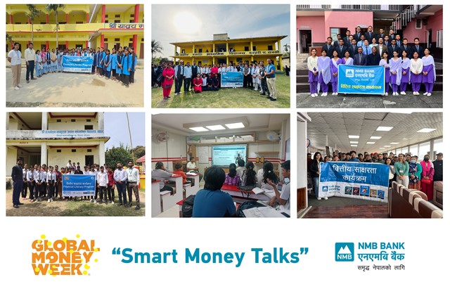 काठमाडौं । एनएमबि बैंकले ग्लोबल मनी वीक २०२६ को अवसरमा देशभर विभिन्न वित्तीय साक्षरता कार्यक्रम सम्पन्न गरेको छ । युवा पुस्तामा वित्तीय ज्ञान र सचेतना अभिवृद्धि गर्ने उद्देश्यले बैंकले आफ्ना शाखामार्फत विभिन्न विद्यालय, कलेज तथा समुदायस्तरमा वित्तीय साक्षरता कार्यक्रम सञ्चालन गरेको हो ।