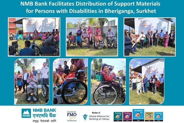 काठमाडौं । एनएमबि बैंकको संस्थागत सामाजिक उत्तरदायित्व अन्तर्गत सुर्खेतको भेरिगङ्गा नगरपालिकामा अपाङ्गता भएका व्यक्तिहरूलाई सहायक सामग्री वितरण गरिएको छ ।