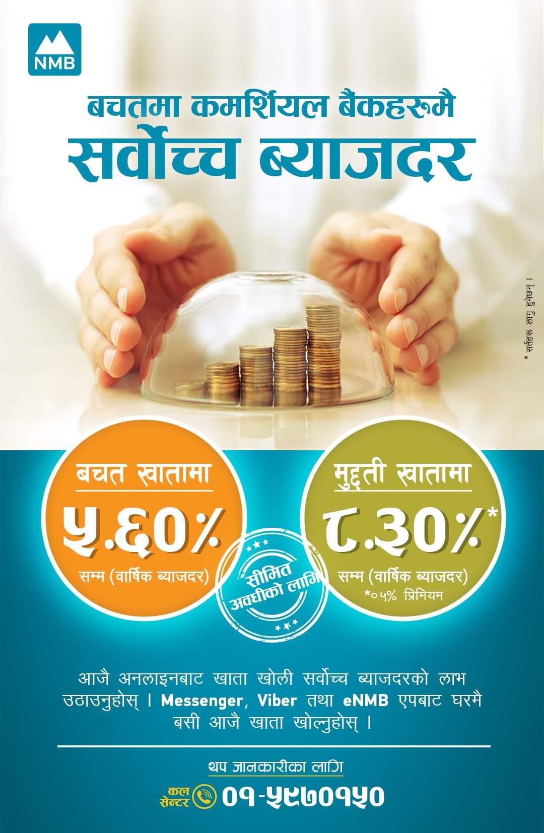 हाल मुख्यतया बैंकहरुले कर्जा सापटीमा केन्द्रित रहेकोे देखिएता पनि एनएमबिले भने स–साना निक्षेपकर्ताहरुलाई मर्का नपरोस भन्ने उद्घेश्यले बचतमा अधिकतम ब्याजको योजना अघि सारेको हो’ बैंकद्वारा जारी विज्ञप्तिमा उल्लेख छ ।