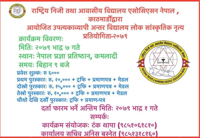 राष्ट्रिय निजी तथा आवासीय विद्यालय एसोसिएसन नेपालकाठमाडौंले उपत्यकाव्यापी अन्तर विद्यालय लोक सांस्कृतिक नृत्य प्रतियोगिता २०७९ आयोजना गर्ने भएको छ ।