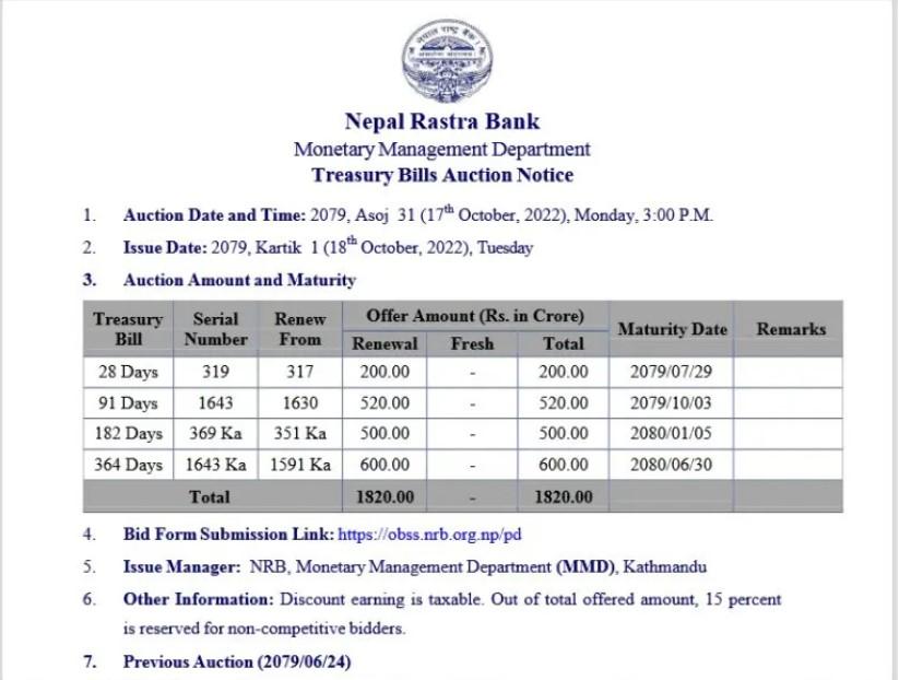 बिक्री गरिने कुल ट्रेजरी मध्येमा २८ दिने अवधिको दुई अर्ब, ९१ दिने अवधिको पाँच अर्ब २० करोड, एक सय ८२ दिने अवधिको पाँच अर्ब र तीन सय ६४ दिने अवधिको छ अर्ब रुपैयाँ बराबरको रहेका छन् ।