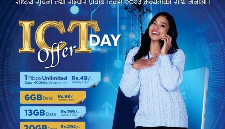 काठकाडौं । नेपाल टेलिकमले राष्ट्रिय सूचना तथा सञ्चार प्रविधि दिवस २०२३ को अवसरमा ग्राहकहरुका लागि आईसीटी डे अफर (ICT Day Offer) अफर उपलब्ध गराएको छ । सो अवसरमा कम्पनीले भ्वाइस र डाटा प्याकेज उपलब्ध गराएको हाे । यो अफर यही बैशाख १७ गते देखि प्रारम्भ भएको छ र आगामी बैशाख १९ गते सम्म लागु हुने कम्पनीलले जनाएको छ ।