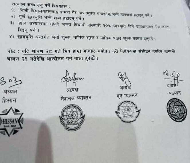 हिसान, नेसनल प्याब्सन, एन प्याब्सन र प्याब्सनले आइतबार संयुक्त विज्ञप्ति जारी गर्दै शिक्षा विधेयकमा राखिएका केही वाक्यांश र प्रावधान अस्वीकार्य भएको बताएका छन् । उनीहरूले ‘निजी विद्यालयहरूलाई क्रमशः गैरनाफामूलक बनाइनेछ’ भन्ने वाक्यांश हटाउन, ‘पूर्ण छात्रवृत्ति’ भन्ने शब्द खारेज गर्न, हालको १० प्रतिशत छात्रवृत्ति दिने प्रावधानलाई निरन्तरता दिन र छात्रवृत्तिअन्तर्गत भर्ना, वार्षिक तथा मासिक शुल्क कायम राख्न माग गरेका छन् ।