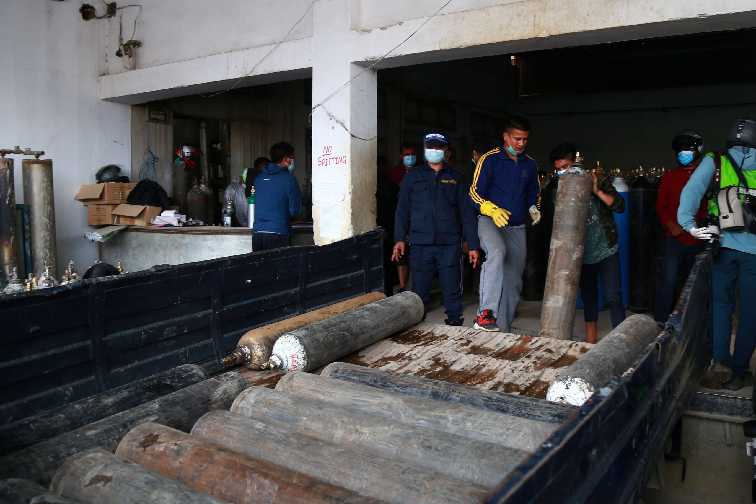 बालाजुमा औद्योगिक क्षेत्र भित्र रहेको शंकर अक्सिजन ग्यास उद्योगमा अक्सिजन लोड गदै प्रहरी र हस्पिटलका कर्मचारीहरु ।