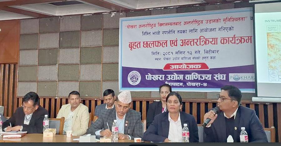 कार्यक्रम तथा पोखरा उद्योग वाणिज्य संघका अध्यक्ष गोकर्ण कार्कीले पोखरा एयरपोर्टसँग पोखरा उद्योग वाणिज्य संघको भावनात्मक सम्बन्ध गाँसिएको बताउँदै यहाँबाट अन्तर्राष्ट्रिय उडान सुनिश्चिताको लागि संघले आवश्यक परे दबाबमूलक कार्यक्रमसमेत गर्ने घोषणा गरे ।