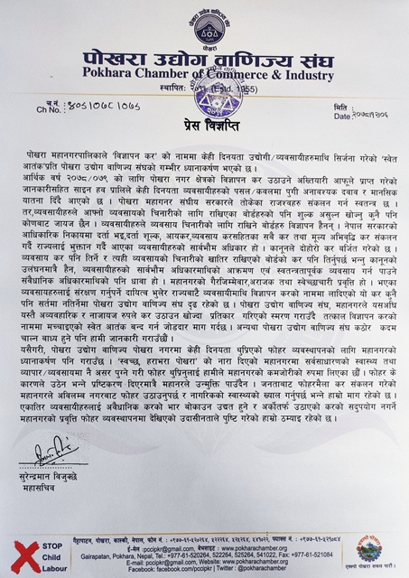व्यवसायीहरुलाई कर तिर्न ताकेता गरिएपछि छाता संस्था पोखरा उद्योग वाणिज्य संघले कडा शब्दमा आपत्ति जनाएको छ । संघले महानगरको सहमतिमा भएको यो ज्यादतिलाई ‘स्वेत आतंक’को संज्ञा दिएको छ । पोखरा उद्योग वाणिज्य संघका महासचिव सुरेन्द्रमान विजुक्छेले बुधबार प्रेस विज्ञप्ति जारी गर्दै विज्ञापन करको नाममा मच्चाइएको स्वेत आतंक बन्द गर्न माग गर्दै अन्यथा कदम चाल्ने चेतावनी दिएका छन् ।