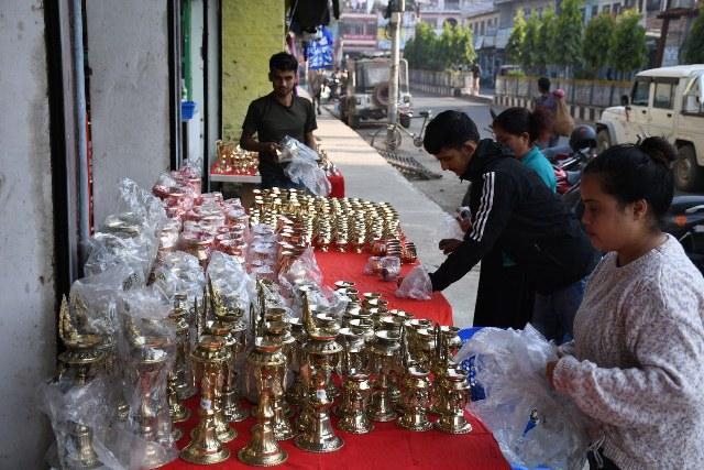 धन्तेरसका दिन भाँडाकुँडा बिक्री गर्नका लागि पसलअगाडि सजाउँदै घोराही–१५ न्युरोडका भाँडा व्यवसायी ।