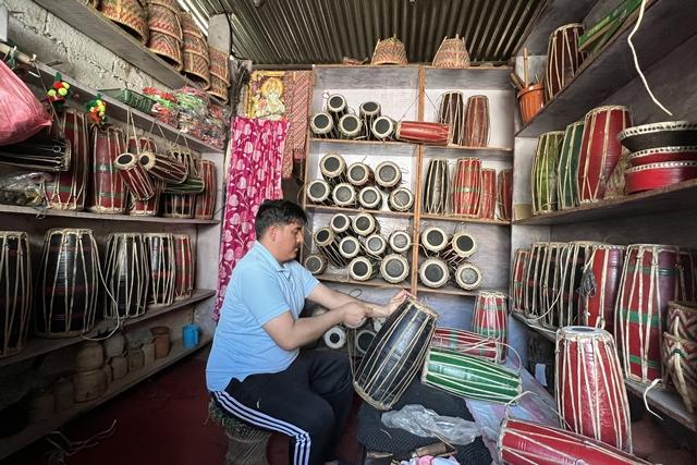 ढोरपाटन । तिहारका लागि मादल बनाउँदै बागलुङ बजारका मादल व्यवसायी । पछिल्लो समय आधुनिकताले गर्दा मादल बिक्री नभएको व्यवसायीहरुको गुनासो छ । तस्बिर : डम्मर बुढामगर/रासस