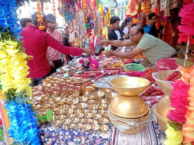 सुनसरी । सुनसरीको इनरुवा बजारमा शनिबार तिहारका लागि आवश्यक सामान किनमेल गर्दै स्थानीय । तस्बिर :नवीन गड्तौला/रासस