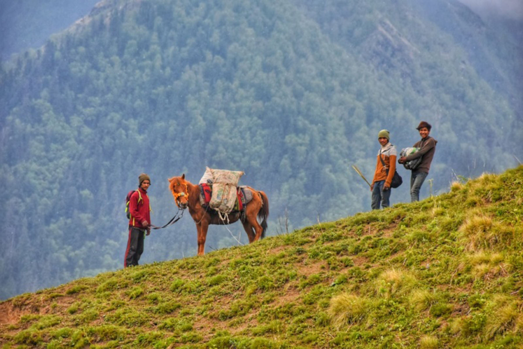 गोठिचौर गाँउपालिका वडा नं ३ जुम्लाका स्थानीय युवाहरुहरु तीन हजार सात सय मिटर उचाइमा रहेको खुन्खु पाटनबाट सेतक चिनी सङ्कलन गरी घोडामा ढुवानी गरेर घरतर्फ लगिँदै ।