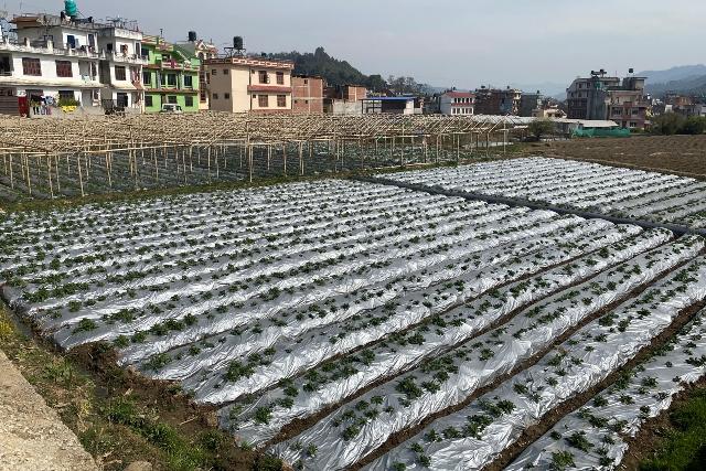 काभ्रेपलाञ्चोक । काभ्रेपलाञ्चोकको पनौती नगरपालिका–४ टौखालमा आधुनिक ‘मल्चिङ’ (छापो हाल्ने प्रविधि)मार्फत गरिएको आलुखेती । यो प्रविधि अपनाएर खेती गर्दा आलुमा लाग्ने रोग र कीरा कम हुनुका साथै उत्पादकत्व बढ्ने कृषक बताउँछन् । तस्बिरःराजकुमार पराजुली/रासस