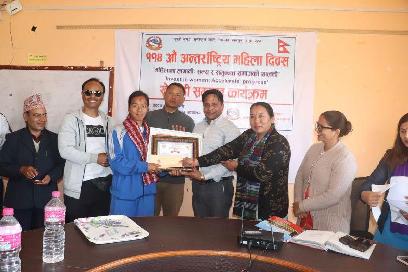 अन्तर्राष्ट्रिय महिला दिवसको अवसरमा खेल क्षेत्रमा प्रोत्साहन गर्दै पाल्पाको रामपुर नगरपालिकाले महिला भलिबल खेलाडीलाई नगदसहित सम्मान गर्दै ।