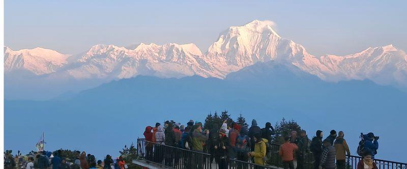म्याग्दी । चक्रिय अन्नपूर्ण पदमार्ग अन्तर्गत म्याग्दीको अन्नपूर्ण गाउँपालिका–६ मा अवस्थित पर्यटकीयस्थल पुनहिलबाट हिमश्रृङ्खला अवलोकन गर्दै पर्यटक । तस्बिरः कमल खत्री/रासस