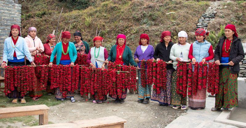 म्याग्दीको अन्नपूर्ण गाउँपालिका–६ खिबाङमा पर्यटक र पाहुनाको स्वागतमा गुराँसको फूलबाट बुनेका माला लिएर बसेका आमाहरु ।