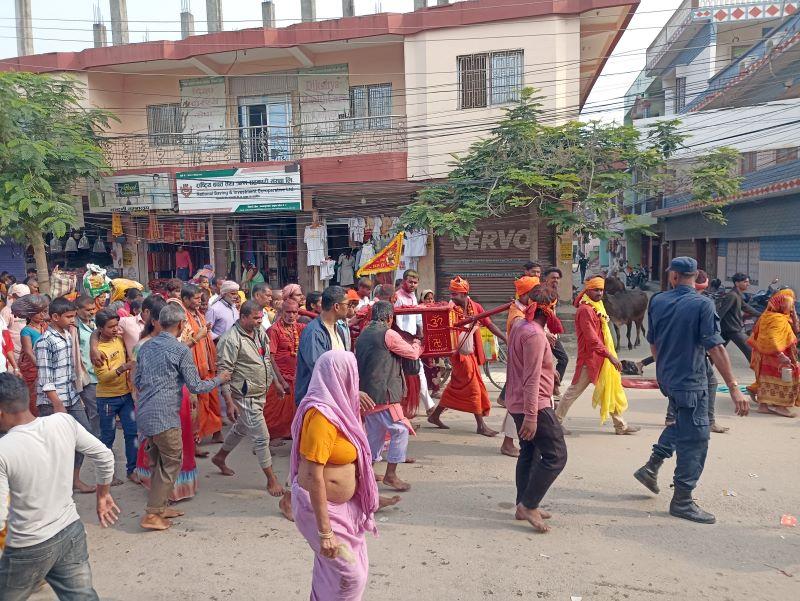 महेन्द्रनगर (धनुषा) । माध्यमिकी परिक्रमा अन्तर्गत जनकपुरधाममा सोमबार अन्तरगृह परिक्रमामा डोला घुमाउँदै । फागुन औंसीका दिन थालिएको १५ दिने माध्यमिकी परिक्रमा नेपाल र भारत गरि कुल १३३ किलोमीटर दुरी यात्रा गरेर आज फागु पूर्णिमाको दिन सम्पन्न हुने गर्दछ । तस्बिर: निरंजनकुमार साह/ रासस