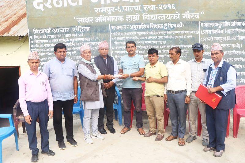 रामपुर (पाल्पा) । दरैठाँटी माध्यमिक विद्यालय रामपुर पाल्पामा अक्षयकोष स्थापनाका लागि रामपुर नगरपालिका–६ निवासी स्वर्गीय चुत्रकला लम्सालको सम्झनामा सहयोग स्वरुप रु एक लाख रकम हस्तान्तरण ।