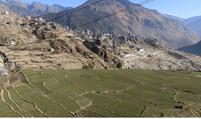 मुगु । यस वर्ष माघ महिना सकिन लाग्दासम्म पनि हिउँ नपरेकाले मुगुको छायानाथ रारा नगरपालिका वडा नं २ मा रहेको चयनजिउलोस्थित जमिनमा लगाइएको फस्टाउन नसकेको गहुँ र जौं बाली । तस्बिरः नृपेन्द्रबहादुर मल्ल/रासस