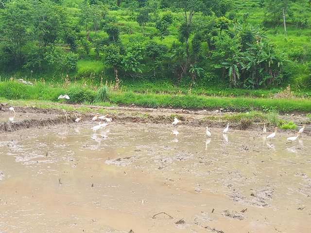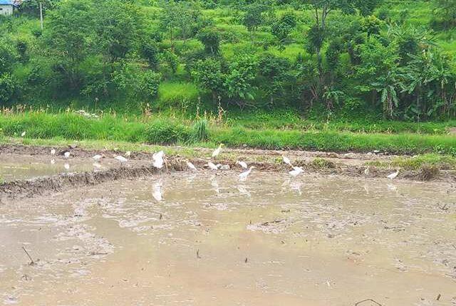 तनहुँ । रोपाई पछि हिलोमा आहारा खोज्दै बकुल्लाको बथान