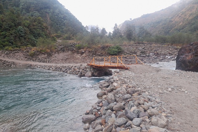 फुङ्लिङ । ताप्लेजुङको फक्ताङ्लुङ गाउँपालिका वडा नं ५ र ६ जोड्ने तमोर नदीमाथि निर्माण गरिएको मोटर गुड्ने काठेपुल । तस्बिरः दिलकुमार लिम्बू/रासस