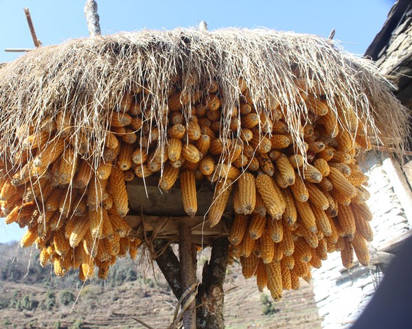 गलेश्वर । घुन, पुतली र कीरा नलागोस् र नकुहियोस् भनी म्याग्दीको रघुगङ्गा गाउँपालिका–६ पाखापानीका किसानले थाँक्रामा राखेको मकै । तस्बिरः ध्रुवसागर शर्मा/रासस