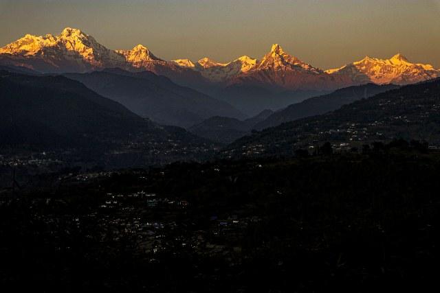 कुश्मा । पर्वतको रुग्दीबाट साँझपख देखिएका माछापुच्छ्रे अन्नपूर्णलगायतका हिमशृङखला । कुश्मा बजार आसपासका गाउँहरू अँध्यारो बन्दै गर्दा माथिका हिमालहरूमा अस्ताउँदो सूर्य किरण पोखिन्छ र सुनौलो बनेर मनमोहक तुल्याउने गर्छ । तस्बिर : सुमनजङ्ग थापा/रासस