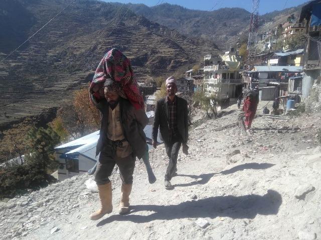 मुगु । आमा बिरामी भएपछि छायानाथ रारा नगरपालिका–५ बाट उपचारका लागि सदरमुकाम गमगढीस्थित जिल्ला अस्पताल ल्याउँदै राजु विक । यहाँ अधिकांश बिरामीहरु यसरी नै बोकेर अस्पतालसम्म ल्याउँने गरिन्छ । तस्बिर : रामदेवी खडका, रासस
