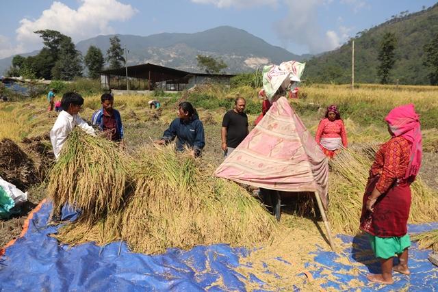 काठमाडौं टोखा नगरपालिका–२ स्थित चण्डेश्वरी खेतमा किसान धानबाली काट्दै थ्रेसिन मिसनबाट चुटदै । अहिलेको समयमा काठमाडौं किसान धान काट्न व्यस्त देखिन्छन् ।