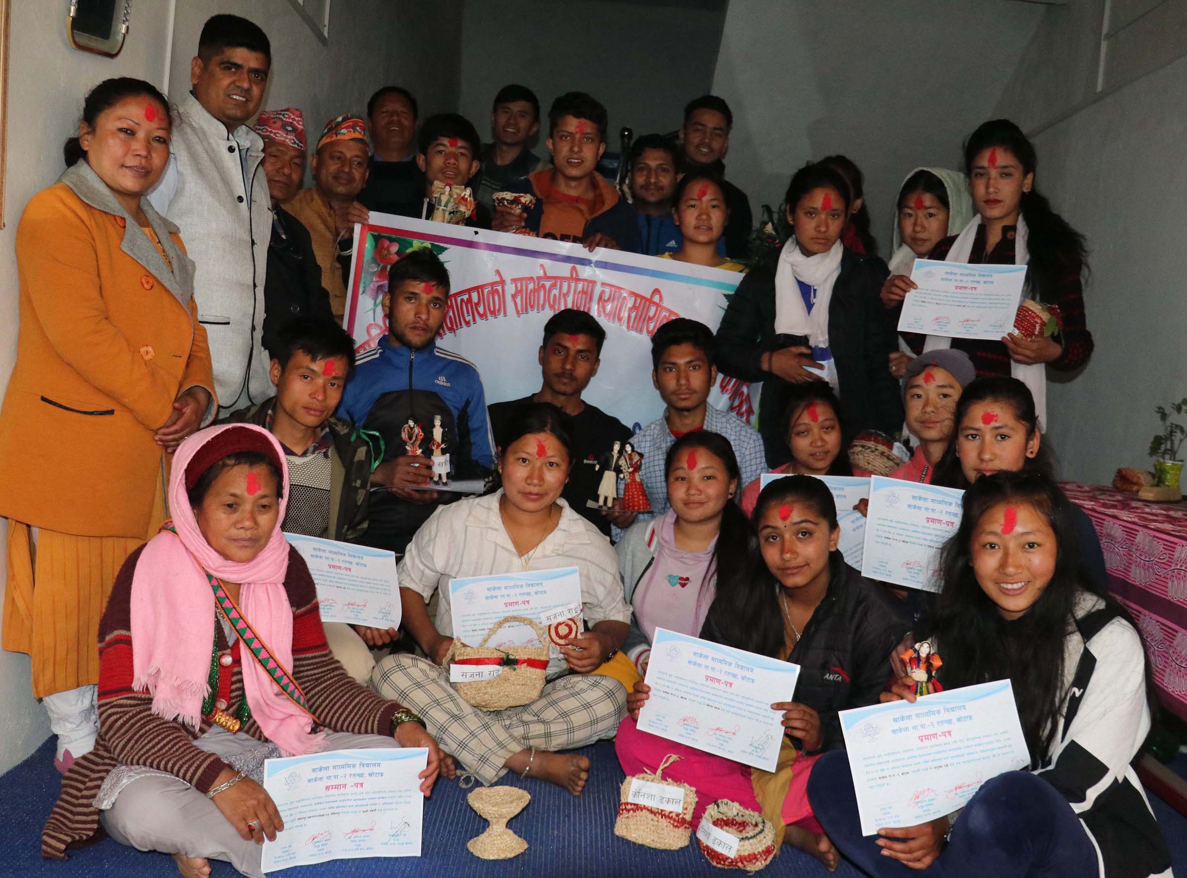सामूहिक तस्वीर खिचाउँदै मकैको खोस्टाबाट घरायसी तथा हस्तकलाका सामग्री बनाउने तालीममा सहभागी विद्यार्थी तथा प्रशिक्षक । प्रधानमन्त्री कृषि आधुनिकीकरण परियोजना मकै जोन खोटाङको सहयोगमा साकेला माध्यमिक विद्यालयले सातदिने तालीमको आयोजना गरेको हो ।