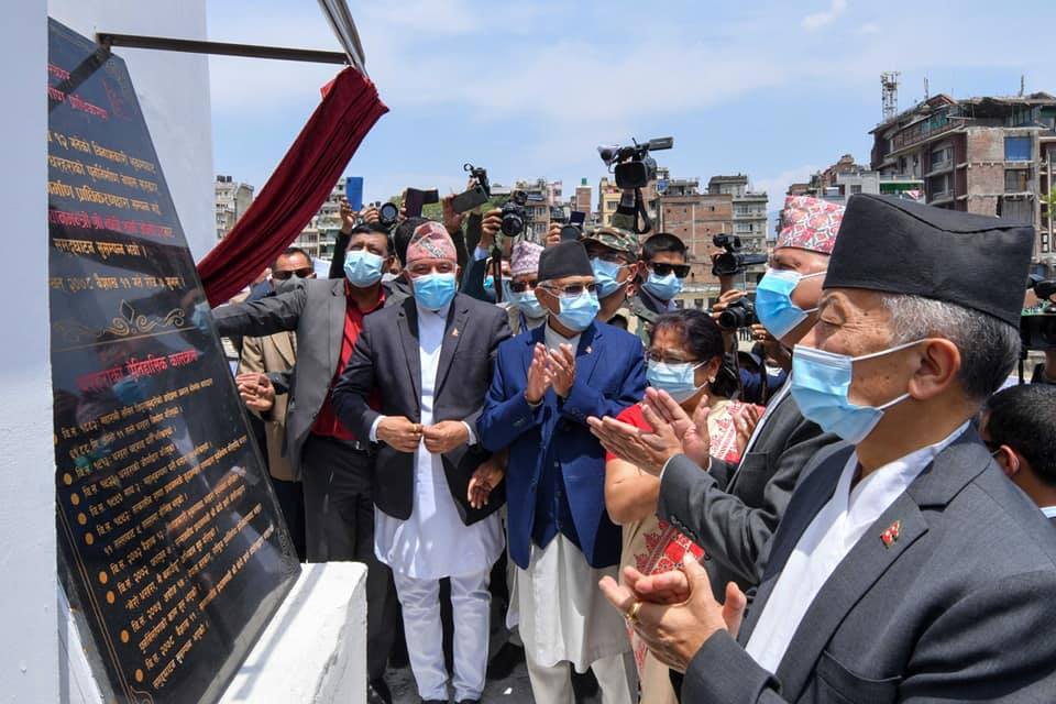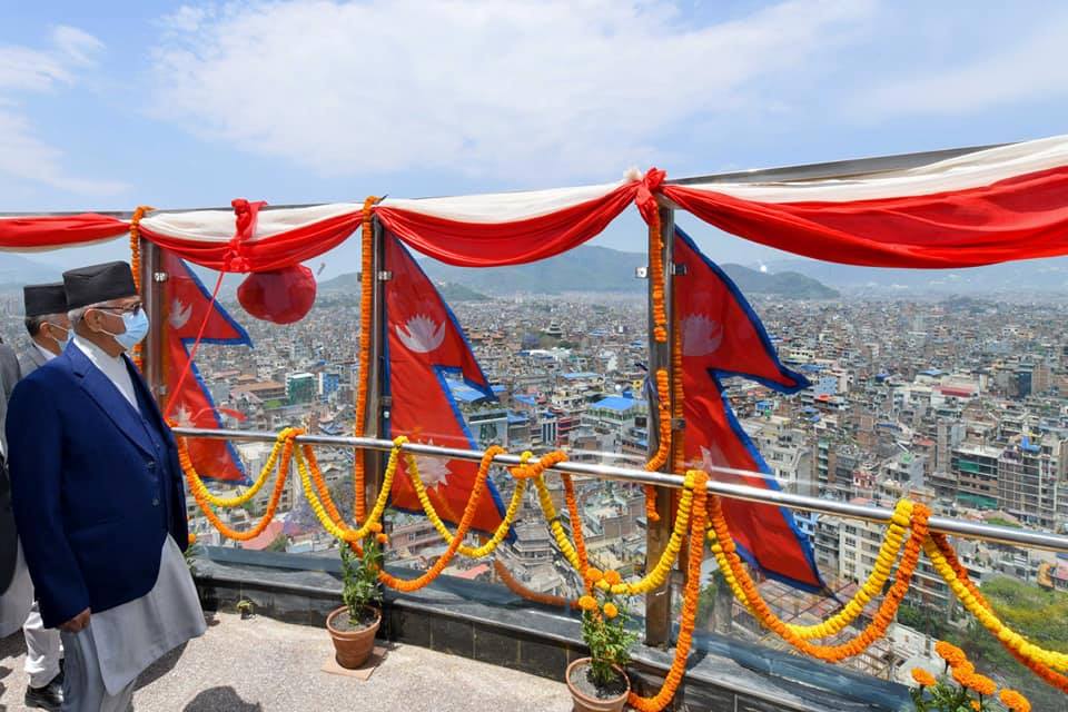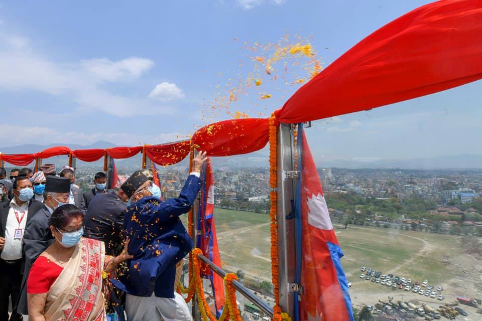 काठमाडौं । पुन निर्मित ऐतिहासिक भीमसेन स्तम्भ धरहराको २०ओैं तल्लाबाट पुष्पवृष्टि गरी प्रधानमन्त्री केपी शर्मा ओलीले शनिबार समुद्घाटन गरेका छन् । तस्विर : प्रधानमन्त्रीको सचिवालय