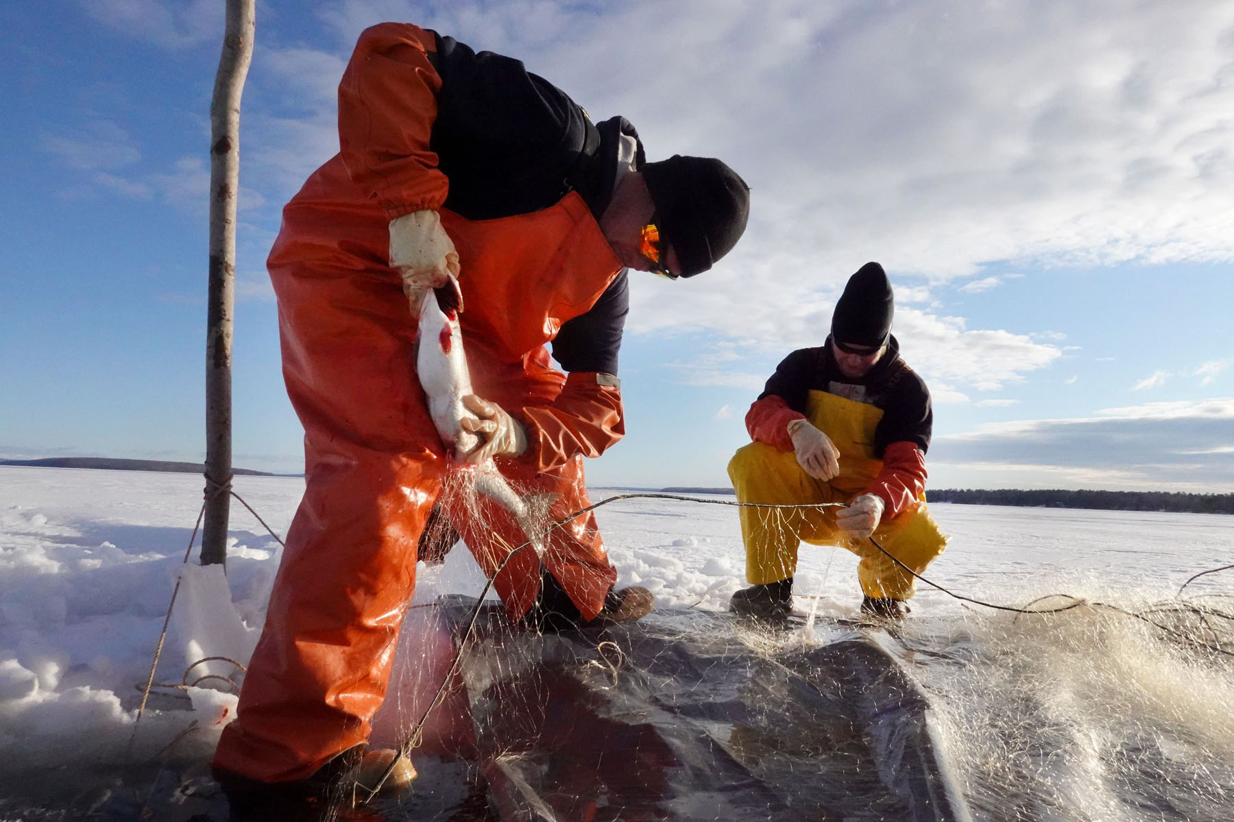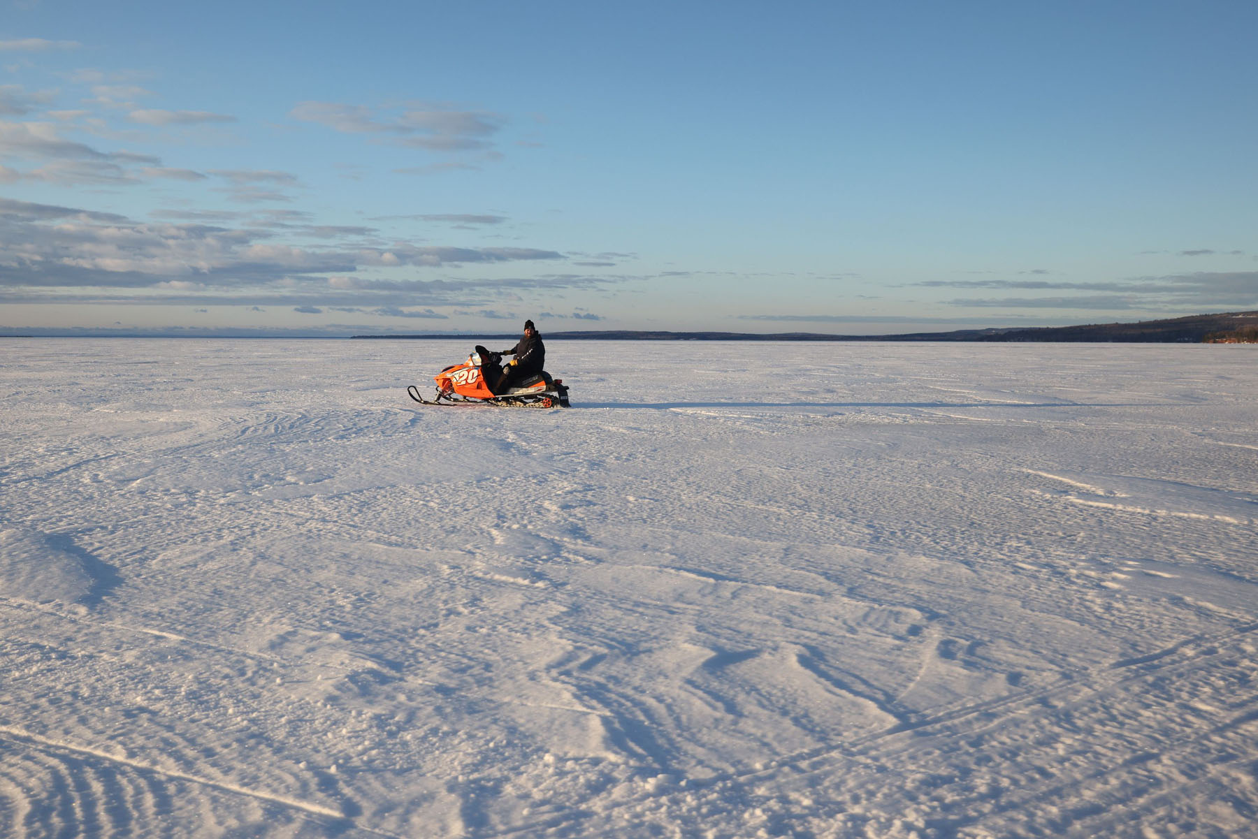 Commercial fisherman Jeremy Milligan heads out to check his nets while fishing on Lake Superior on February 23, 2021 in Bayfield, Wisconsin. During winter months when ice on the lake is too thick for boats, commercial fishermen navigate the lake on snowmobiles, cutting holes through the ice to set their fishing nets. Scott Olson/Getty Images/AFP
