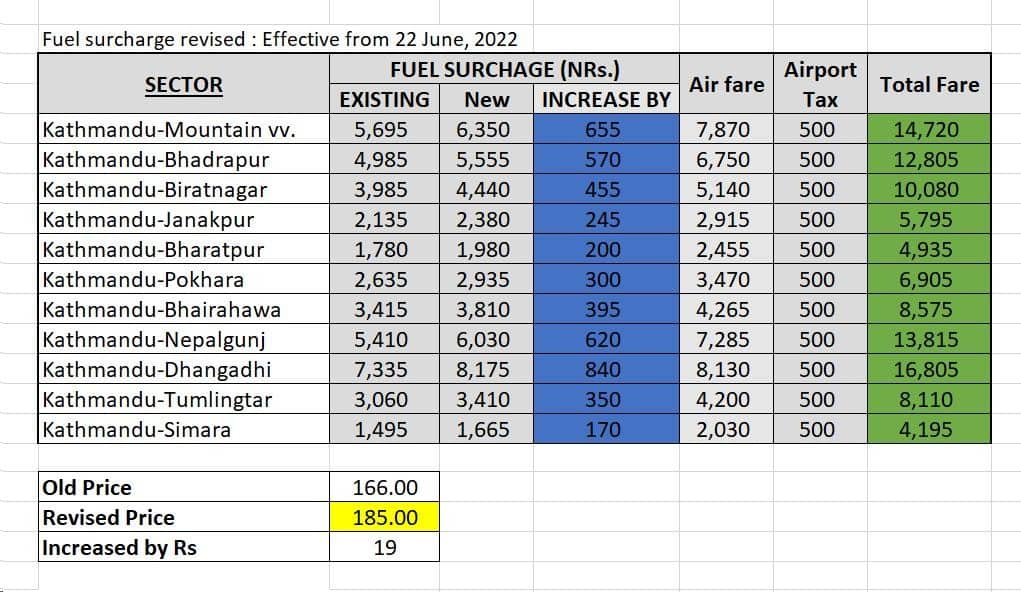 बढेको भाडा असार ८ गते देखि लागू हुने बताईएको छ । एअरपोर्ट ट्याक्स अन्तरास्ट्रिय बिमानस्थलको हकमा रु ५०० र अन्य बिमानस्थलमा रु ४०० र ३०० कायम गरिएको छ । काठमाडौंबाट धनगडीको उडानको लागि रु १६ हजार ८०५ भाडा कायम गरिएको छ । काठमाडौंबाट माउन्टेन्ट उडानको भाडादर रु १४७२० कायम गरिएको छ भएको छ ।