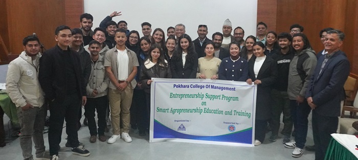 पोखरा । पोखरा कलेज अफ म्यानेजमेन्टको आयोजना तथा युनिभर्सिटी ग्राण्ट कमिसनको सहयोगमा एन्टरप्रोनियरशिप सपोर्ट प्रोग्राम अन्तर्गत ‘स्मार्ट एग्रोप्नरशिप एजुकेशन एण्ड ट्रेनिङ्ग’ कार्यक्रम पोखरामा सम्पन्न भएको छ । पाँच दिन सम्म चलेको ४० घण्टे कार्यक्रममा व्यवसायिक कृषिका बारेमा तालिमसंगै सैद्धान्तिक पक्षबारे चर्चा भएको थियो ।