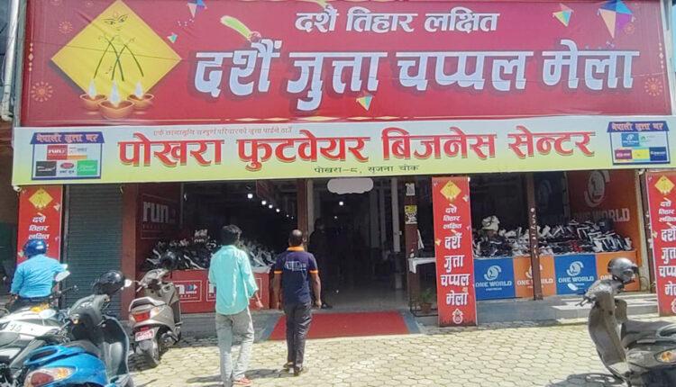 पोखरा । पोखरामा जुत्ता चप्पलहरुको संयुक्त शोरुम सञ्चालन गर्दै आएको पोखरा फुटवेयर बिजनेस सेन्टरमा दसैं तिहार लक्षित ‘दशैं जुत्ता चप्पल मेला’ सुरु भएको छ ।