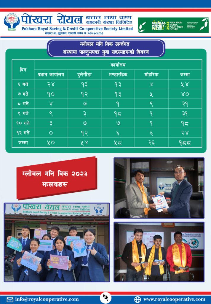 ग्लोवल मनी विक २०२३ को साप्ताहिक कार्यक्रम बमोजिम संस्थाले गत चैत्र ६ देखि १२ गतेसम्म युवा लक्षित विविध गतिविधीहरु सञ्चालन गरेको थियो । सप्ताहको अन्तिम दिन संस्थाले उक्त तथ्याँक सार्वजनक गरेको हो ।
