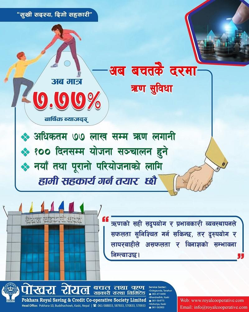 पोखरा । पोखरा रोयल बचत तथा ऋण सहकारी संस्था लिमिटेडले आफ्ना सदस्यहरूलाई लक्षित गर्दै विशेष आकर्षणसहितको कर्जा योजना सार्वजनिक गरेको छ। ‘अब बचतकै दरमा ऋण सुविधा’ भन्ने नारासहित सार्वजनिक गरिएको योजनाअनुसार अब सदस्यहरूले वार्षिक मात्र ७.३३ प्रतिशत ब्याजदरमा कर्जा लिन सक्नेछन् ।