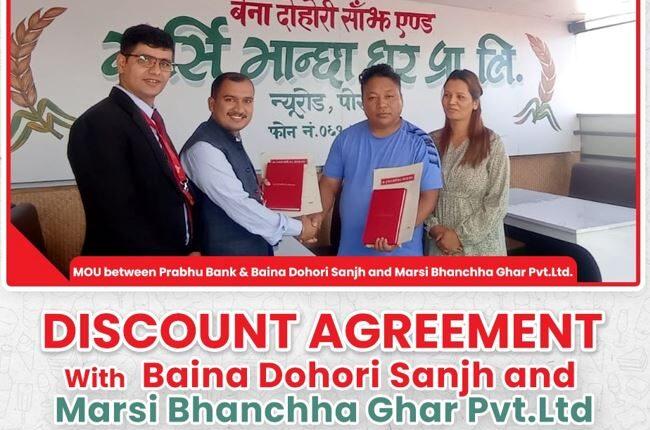 काठमाडौं । प्रभु बैंक लिमिटेड र न्युरोड पोखरा स्थित बैना दोहोरी साझँ एण्ड मार्सी भान्छा घर प्रा.लिबीच विभिन्न सेवाहरुमा छुट प्रदान गर्ने सम्झौता भएको छ ।