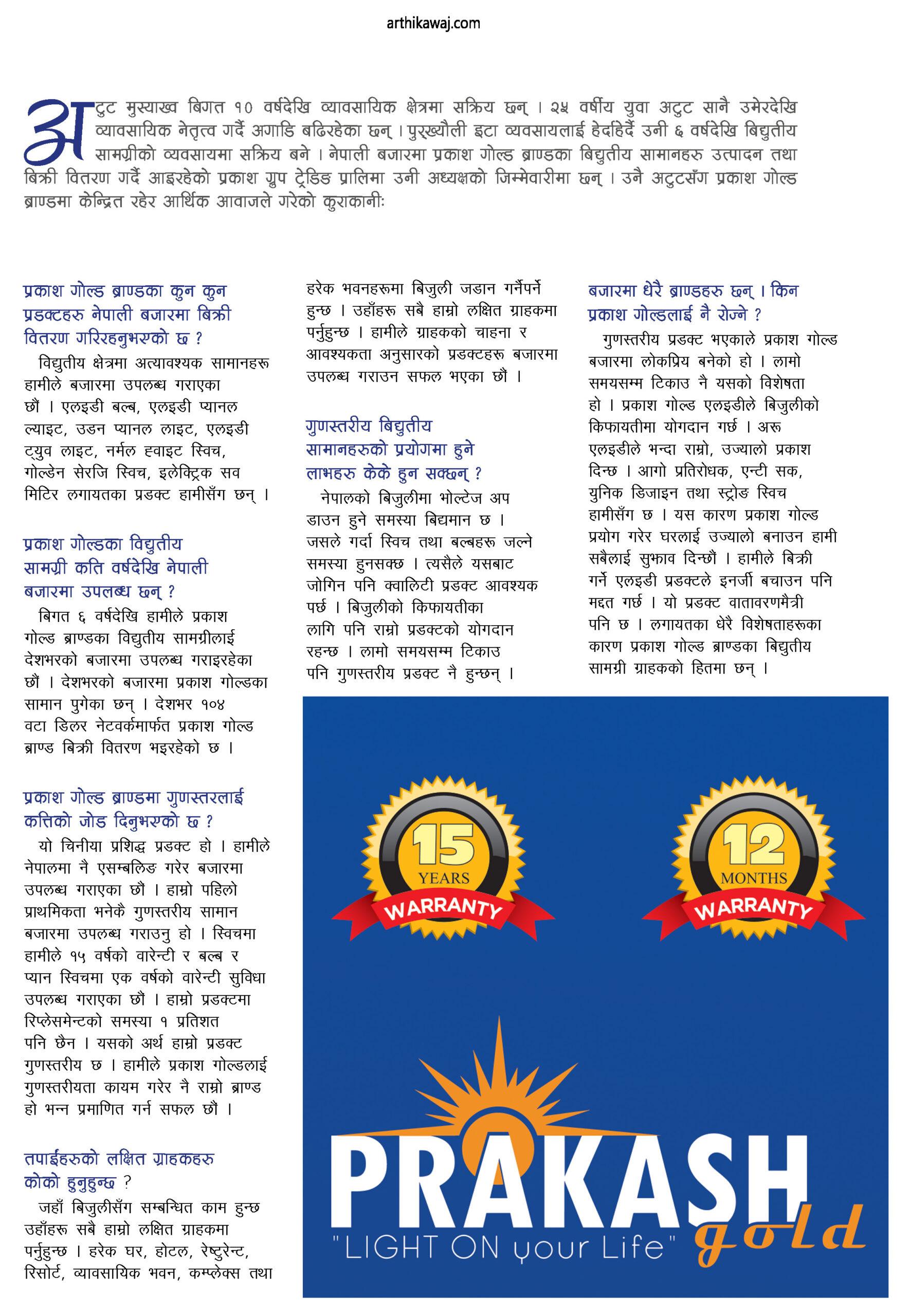 यो चिनीया प्रशिद्ध प्रडक्ट हो । हामीले नेपालमा नै एसम्बलिङ गरेर बजारमा उपलब्ध गराएका छौं । हाम्रो पहिलो प्राथमिकता भनेकै गुणस्तरीय सामान बजारमा उपलब्ध गराउनु हो । स्विचमा हामीले १५ वर्षको वारेन्टी र बल्ब र प्यान स्विचमा एक वर्षको वारेन्टी सुविधा उपलब्ध गराएका छौं । हाम्रो प्रडक्टमा रिप्लेसमेन्टको समस्या १ प्रतिशत पनि छैन । यसको अर्थ हाम्रो प्रडक्ट गुणस्तरीय छ । हामीले प्रकाश गोल्डलाई गुणस्तरीयता कायम गरेर नै राम्रो ब्राण्ड हो भन्न प्रमाणित गर्न सफल छौं ।