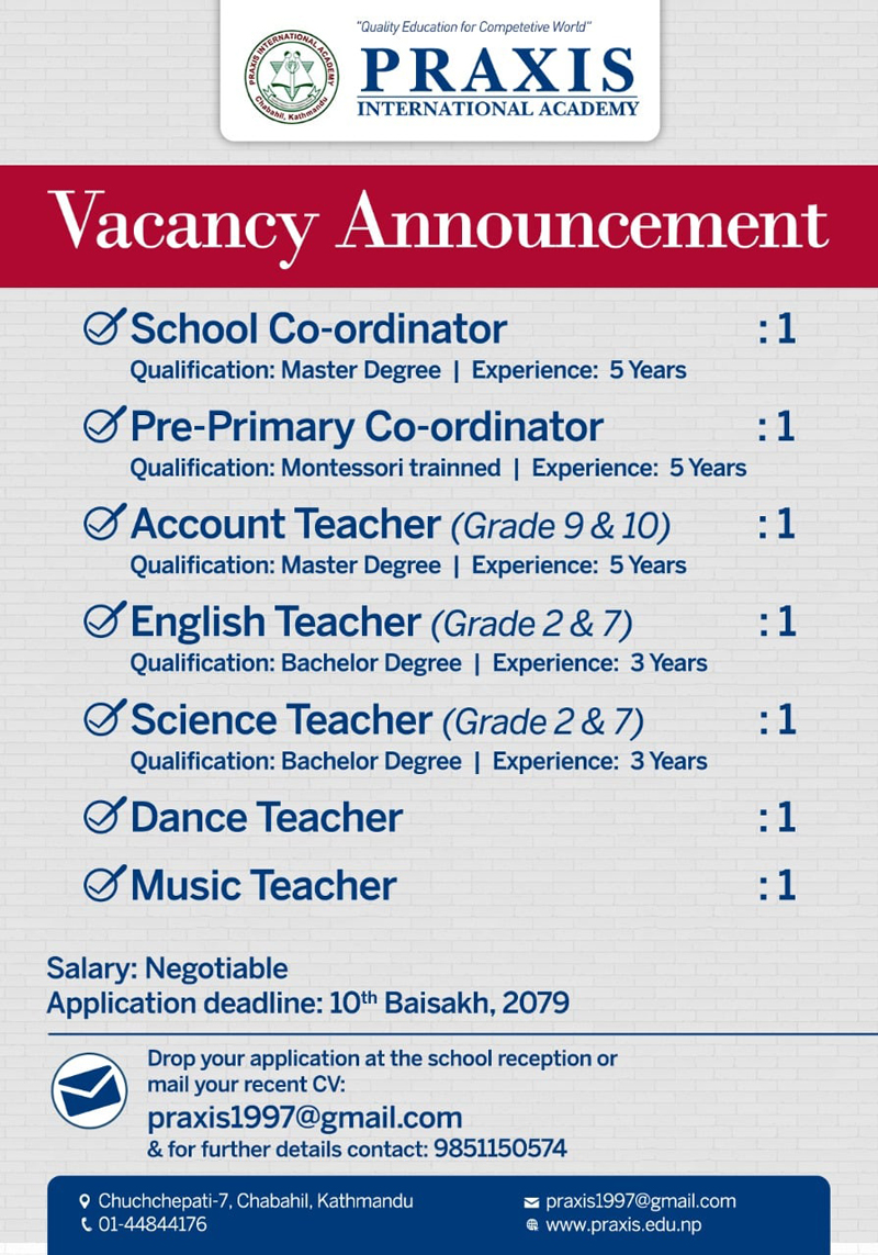 एकेडमीले स्कुल को-अर्डिनेटर, प्रि–प्राइमरी को–अर्डिनेटर, एकाउन्ट टिचर, अँग्रेजी टिचर, साइन्स टिचर, डान्स टिचर र म्युजिक टिचर माग गरेको छ ।