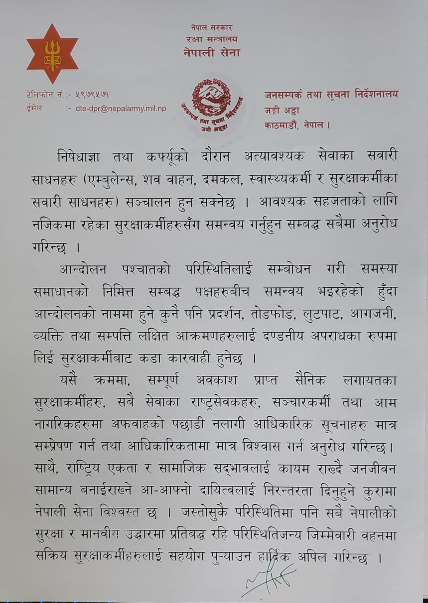 नेपाली सेनाले आन्दोलनका क्रममा जनधनको क्षति, आपराधिक गतिविधि, लुटपाट, आगजनी, सार्वजनिक सम्पत्तिमा तोडफोड, बलात्कार प्रयास, व्यक्ति लक्षित हिंसात्मक आक्रमण जस्ता गतिविधिहरू भएकोप्रति गम्भीर ध्यानाकर्षण गराउँदै नियन्त्रणका प्रयासमा सहयोग गर्न आह्वान गरेको छ।