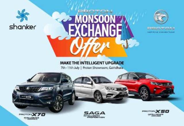 प्रोटोन गाडीले आकर्षक एक्स्चेन्ज बोनससहित ‘मनसुन एक्स्चेन्ज अफर’ ल्याएको छ । काठमाडौं गैरीधारमा रहेको प्रोटोनको सोरुममा ‘मनसुन एक्स्चेन्ज अफर’ सञ्चालन भइरहेको छ । बुधबारदेखि सुरुभएको अफर आइतबारसम्म चल्ने छ ।