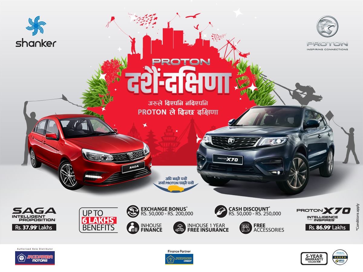 यस प्रोटोन ‘दशैँ-दक्षिणा’ योजना अन्तर्गत ग्राहकले आकर्षक व्याजदर सहितको किस्तावन्दीमा पनि सवारी खरिद गर्न सक्नेछन्, जसका लागि शंकर ग्रुप अन्तर्गतको जगदम्बा सेभिङ एण्ड क्रेडिट को ओपरेटिभ लिमिटेडले इन-हाउस फ़ाइनेन्सिङको सुविधा प्रदान गर्दै आइरहेको छ। यि सेवाका अतिरिक्त नयाँ सवारी खरिदमा ग्राहकले बिभिन्न पाटपुर्जा तथा चाहिने उपकरण हरु समेत सित्तैमा प्राप्त गर्ने छन् ।