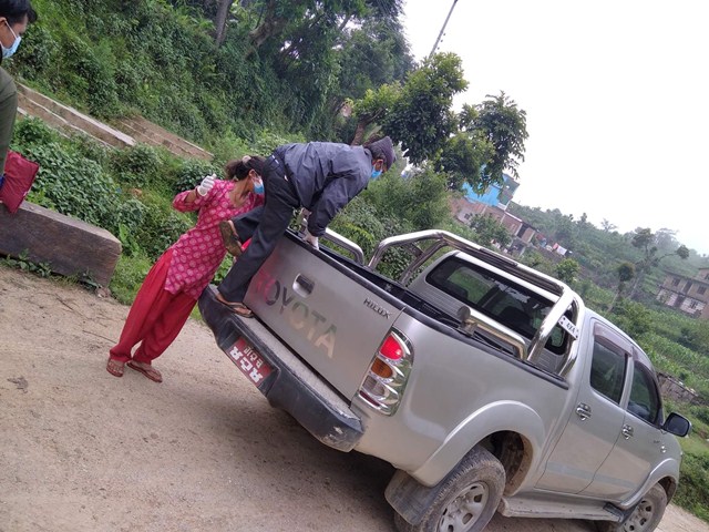 बन्दिपुर गाउँपालिकाका अध्यक्ष पूर्णसिं थापाले कोरोना पोजेटिभ देखिएका बन्दिपुर–४ का एक दम्पत्तीलाई आफ्नै गाडीमा राखेर बुधबार उपचारको लागि पोखरा लैजाने तयारी गर्दै ।