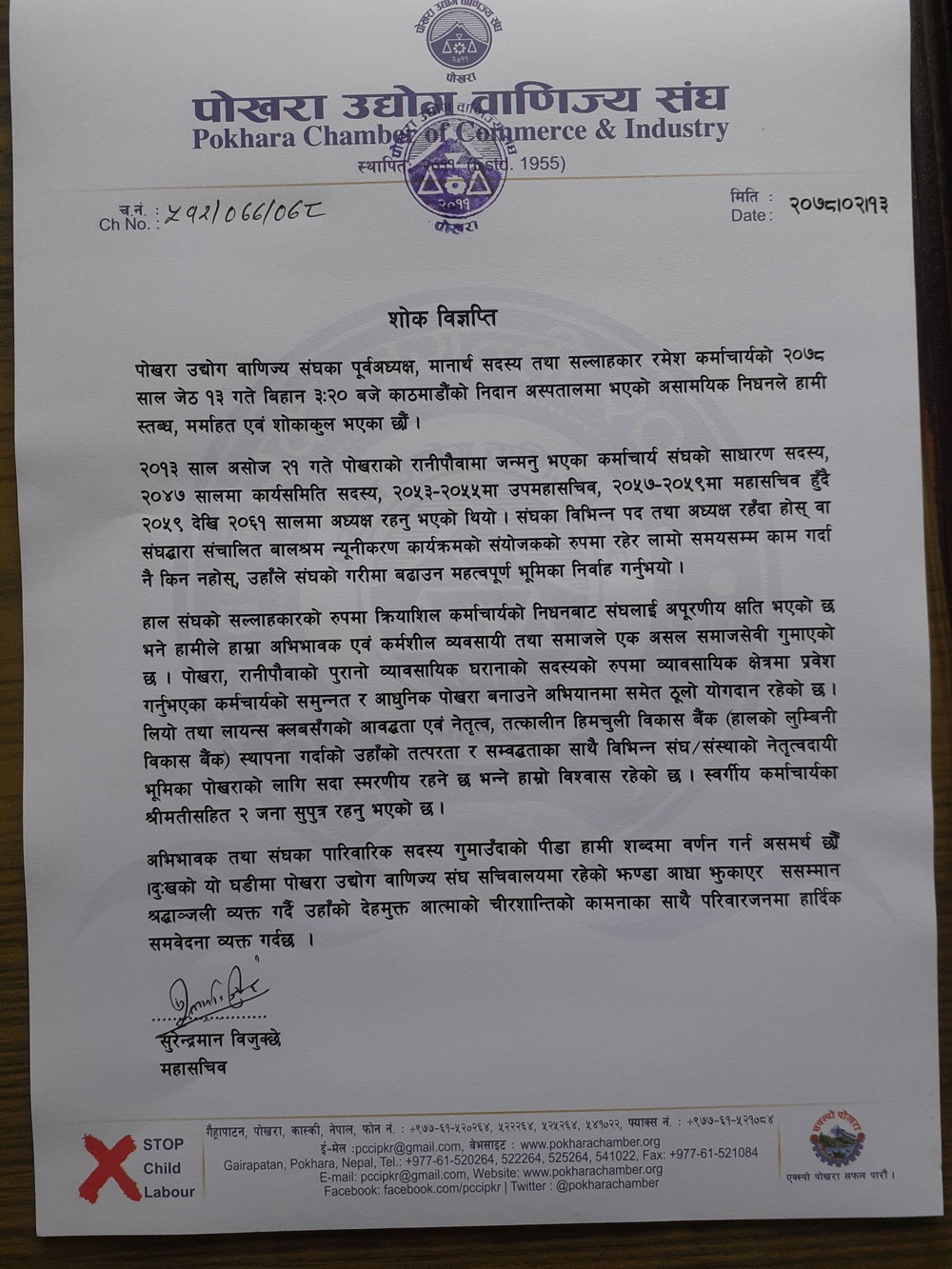 पोखरा उद्योग वाणिज्य संघका पूर्वअध्यक्ष, मानार्थ सदस्य तथा सल्लाहकार रमेश कर्माचार्यकोे २०७८ साल जेठ १३ गते बिहान ३ः२० बजे काठमाडौंको निदान अस्पतालमा भएको असामयिक निधनले हामी स्तब्ध, मर्माहत एवं शोकाकुल भएका छौं ।