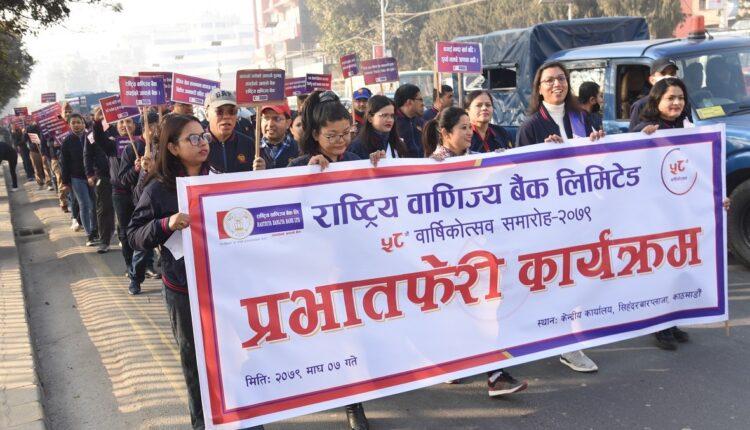 काठमाडौं । राष्ट्रिय वाणिज्य बैंक लि.को ५८ औं वार्षिकोत्सवको पूर्व सन्ध्यामा बैंकको केन्द्रीय कार्यालय परिसर, प्रादेशिक कार्यालयहरु तथा विभिन्न शाखा कार्यालयहरुबाट ‘वित्तीय साक्षरताका लागि प्रभातफेरी’ कार्यक्रमको आयोजना गरिएको छ ।