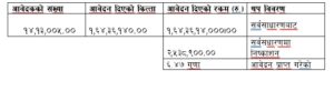 २७ लाख ३० हजार कित्ता मध्ये सामुहिक लगानी कोषलाई ५ प्रतिशत बराबर १ लाख ३६ हजार ५ सय कित्ता तथा कर्मचारीलाई २ प्रतिशत बराबर ५४ हजार ६ सय कित्ता छुट्याई बाँकी रहेको २५ लाख ३८ हजार ९ सय कित्ता शेयर निष्काशन गरिएकोमा निष्काशनको तेश्रो दिन विहान १० बजेसम्म १४ लाख १३ हजार ५ जना सर्वसाधारण लगानीकर्ताहरुबाट १ अर्ब ६४ करोड ३६ लाख १४ हजार रकम बराबरको १ करोड ६४ लाख ३६ हजार १ सय ४० कित्ता शेयरको लागि आवेदन परेको छ । यो आइपिओको निष्काशन तथा बिक्री प्रबन्धकमा प्रभु क्यापिटल लिमिटेड रहेको छ ।