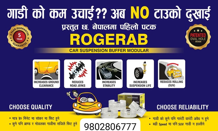 काठमाडौं । सवारीसाधनको ग्राउन्ड क्लियरेन्स कम हुँदा सडकमा ठोक्किने, स्पिड ब्रेकरमा छुने तथा खराब बाटोमा हल्लिने समस्या बढ्दै गएको सन्दर्भमा रोजरएब (Rogerab) नामक आफ्टर–मार्केट एसेसरिजको माग तीव्र रूपमा बढ्दै गएको छ । रोजरएब कार केयर लाउन्ज प्रालिले बजारमा ल्याएको यो उत्पादन गाडीको ग्राउन्ड क्लियरेन्स बढाउन र रफ तथा कच्ची सडकमा पनि सहज ड्राइभिङ अनुभव दिन प्रभावकारी मानिएको छ ।
