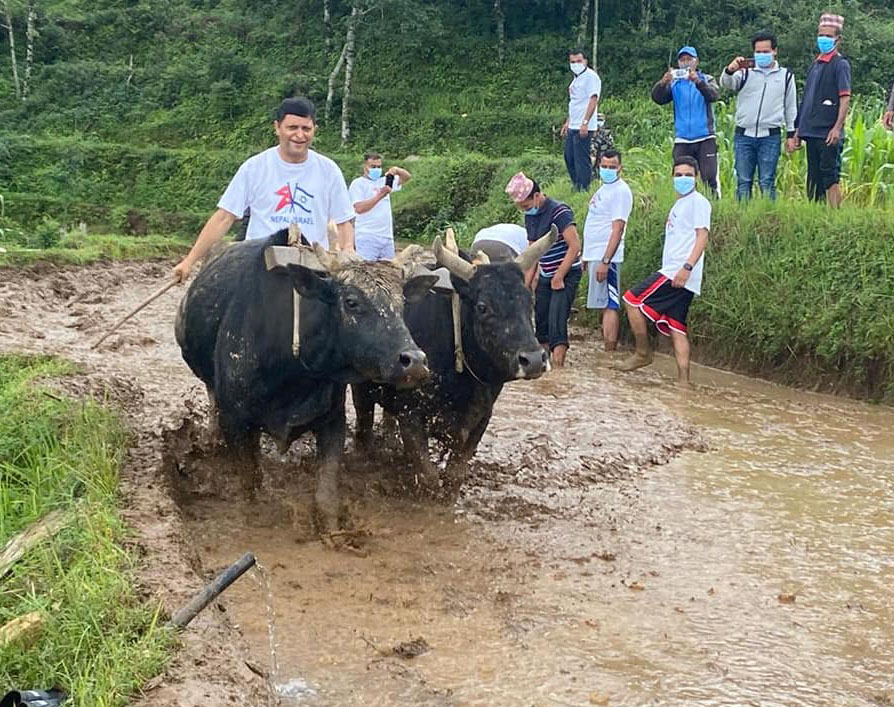 राष्ट्रियसभाका अध्यक्ष गणेशप्रसाद तिमिल्सिना र नेपालका लागि इजरायलका राजदूत हनान गोडर मङ्गलबार अठारौँ राष्ट्रिय धान दिवसका अवसरमा पर्वतको मोदी गाउँपालिका–७, राम्जादेउरालीमा धान रोपाइँ कार्यक्रममा धान रोप्दै । राम्जा अध्यक्ष तिमिल्सिनाको जन्मस्थान हो ।